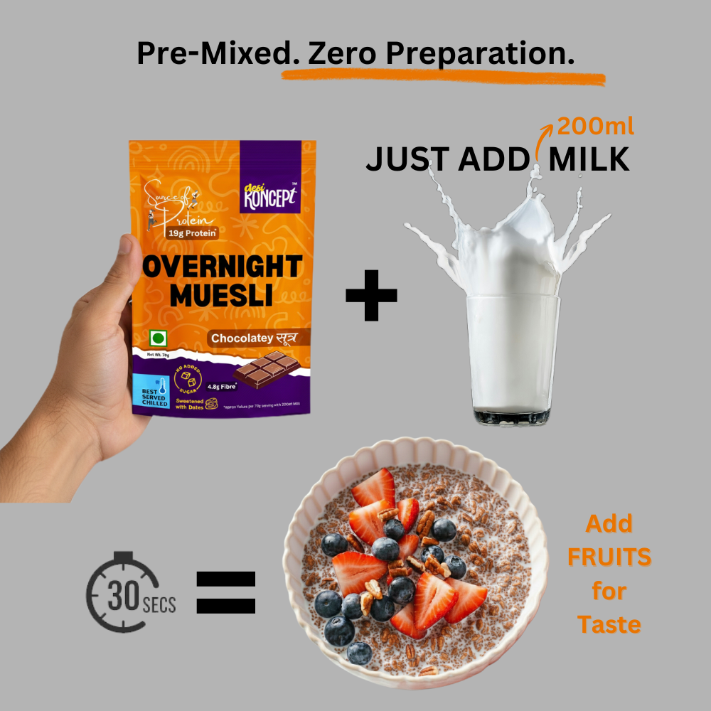 Open up one sachet of desiKONCEPT Muesli and mix it with Cold Milk. Top up with favourite fruits like banana or apple slices. That’s it – enjoy this as a breakfast, snack or guilt free craving buster !