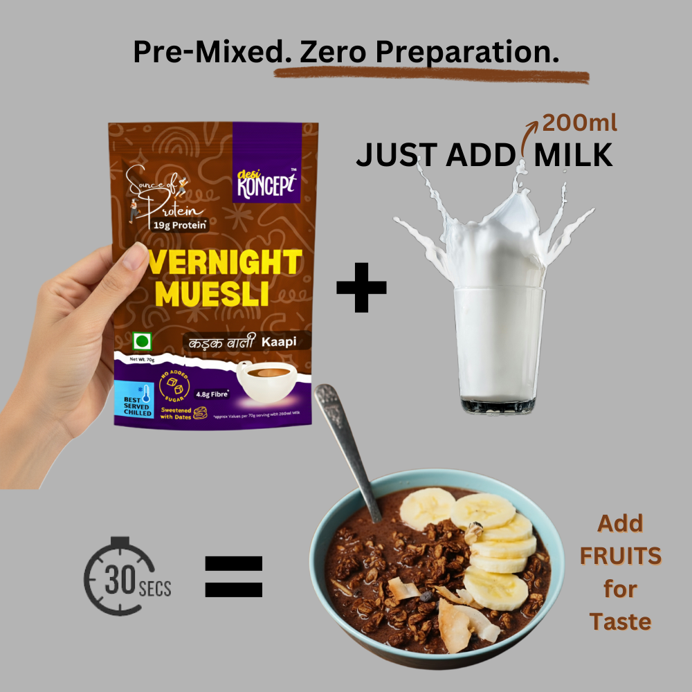 Open up one sachet of desiKONCEPT Muesli and mix it with Cold Milk. Top up with favourite fruits like banana or apple slices. That’s it – enjoy this as a breakfast, snack or guilt free craving buster !